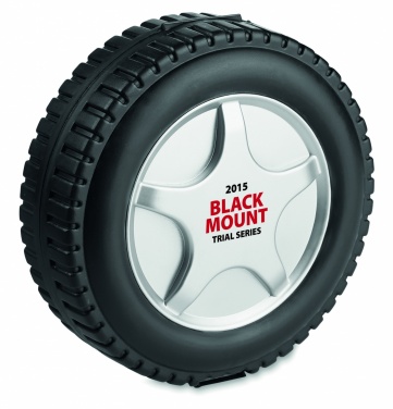 25-teiliges Werkzeug-Set in Form eines Autoreifens. Beinhaltet 1 Verlängerung, 1 Schraubenzieher, 1 Zange, 5 Fassungen, 3 Sechskantschlüssel, 10 Stück Bit-Satz, 2 Präzisionsschraubenzieher und 1 Maßband.
