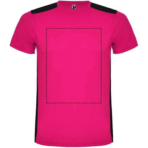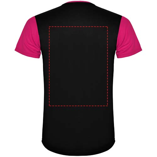 Funktions-T-Shirt aus atmungsaktivem Stoff. Rundhalsausschnitt. Kombination aus zwei Polyestergeweben im Rücken- und Schulterbereich. Polyester Bienenwabe Vorne und 3D-Netz Polyester auf Schulter und Rücken. Material ist feuchtigkeitabsorbierend. Ziernähte auf den Schultern und Seiten. Schnitt mit verlängertem Rückenteil. Abnehmbares Etikett.