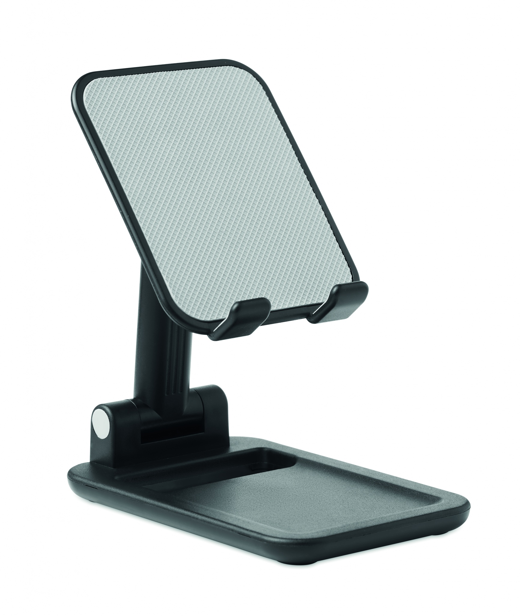 Klappbarer Smartphone- oder Tablet-Halter aus ABS. Sockel mit Anti-Rutsch-Beschichtung. Ermöglicht es dem Benutzer, das Gerät im optimalen Betrachtungswinkel einzustellen.