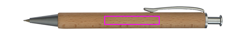 Holzkugelschreiber mit blauschreibender Metall-Systemmine und Holzetui. Die Lasergravur ist unterhalb des Clips angebracht.