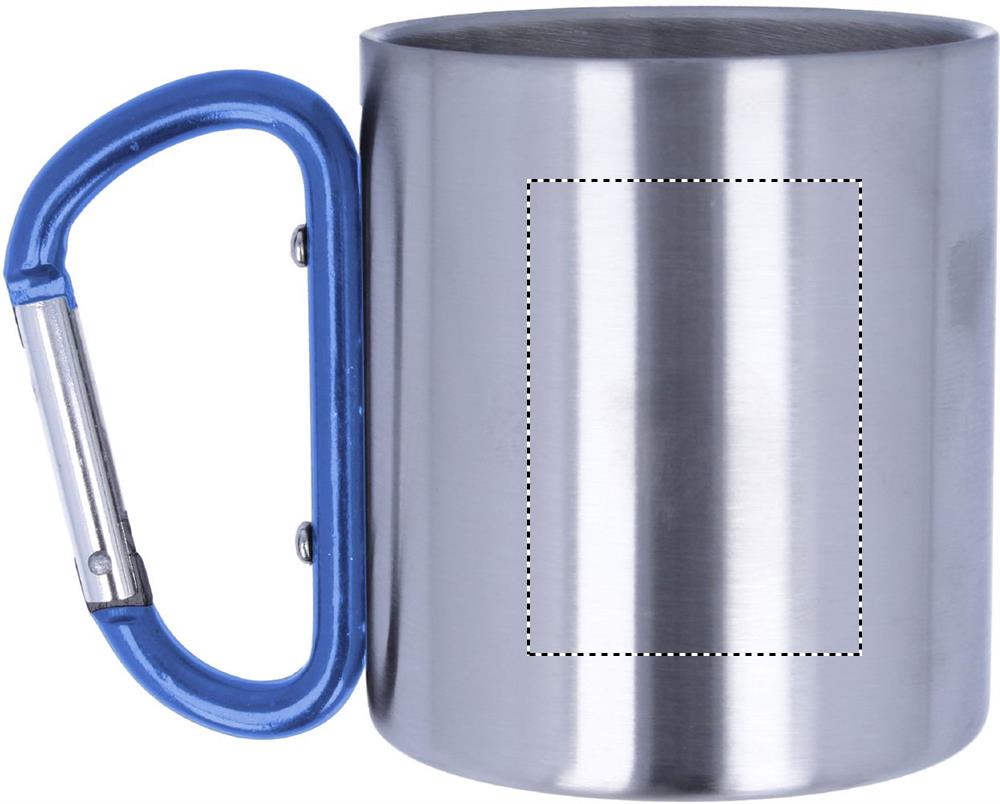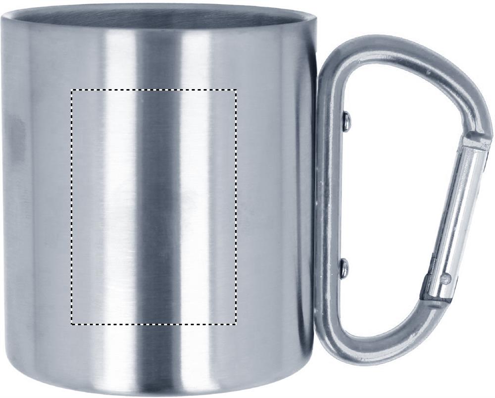Doppelwandiger Trinkbecher aus Edelstahl. Henkel mit Karabiner. Füllmenge: 220 ml. Der Karabiner ist NICHT als Sicherung beim Klettern geeignet.