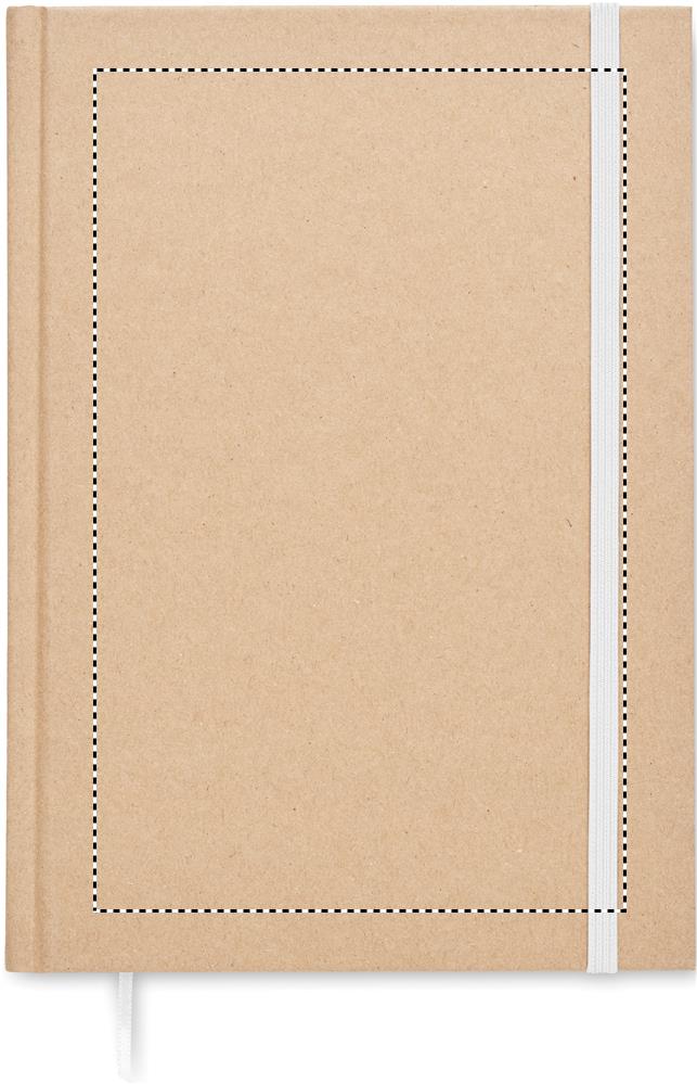 A5 notebook with hard recycled carton cover. Casebound. 200 lined recycled paper pages (100 sheets/80 gsm). Elastic closure strap and ribbon page-marker. Made in EU.