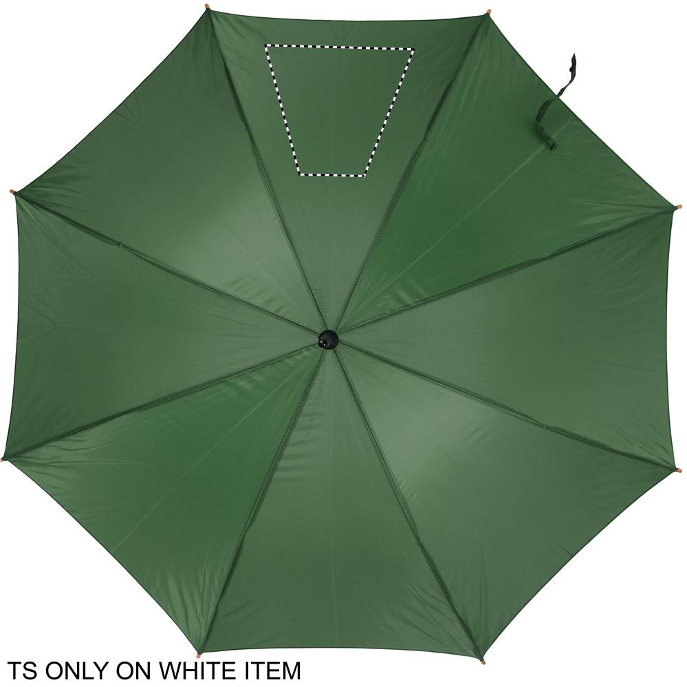 23 inch auto open umbrella in 190T polyester with wooden shaft, tips and top. Black plated metal ribs. Curved natural finish wooden handle.