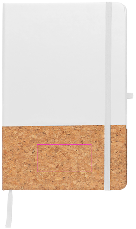 A5 notebook with 160 lined pages and PU cork cover, bookmark, ballpen loop, and elastic closure band. We print your logo on the front.