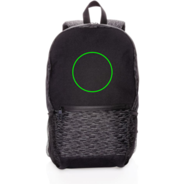 Increase your visibility in style with this backpack made with 100% recycled polyester and AWARE™ tracer. With AWARE™, the use of genuine recycled fabric materials and water reduction impact claims are guaranteed, by using the AWARE disruptive physical tracer and blockchain technology. Save water and use genuine recycled fabrics. The backpack features a modern allover reflective print, a main compartment with 15.6 inch laptop compartment, a front zipper pocket and 2 mesh pockets. Adjustable straps. PVC free. This bag saved 8 liters of water and is made of 16 plastic bottles.