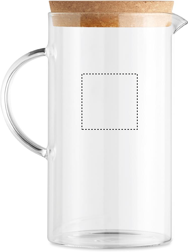 Borosilicate glass water/juice decanter with cork lid. Capacity: 1L. Cork is 100% natural material. Due to its structural nature and surface porosity the final print result per item may have deviations.