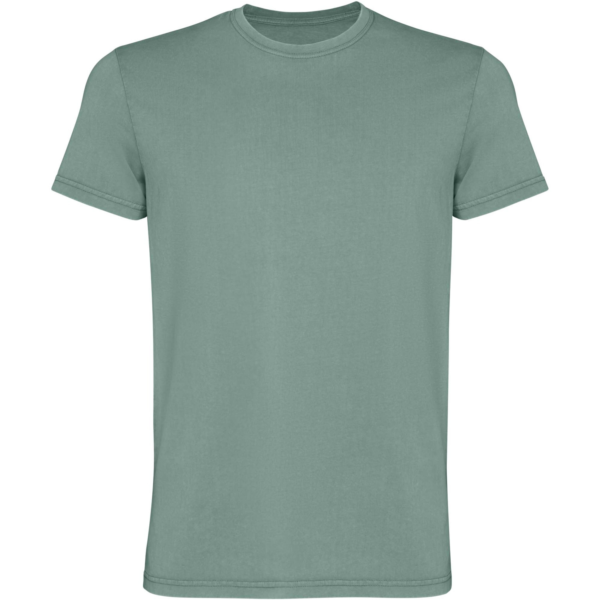 Short sleeve t-shirt for men. Acid-wash finish. 1x1 ribbed crew neck design. Tone-on-tone cover stitch with a polished finish.