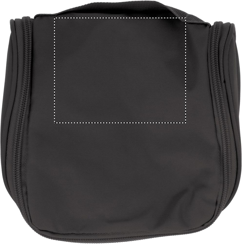 Hanging cosmetic bag with multi-compartments and mesh pockets in high density polyester. Ideal when travelling.