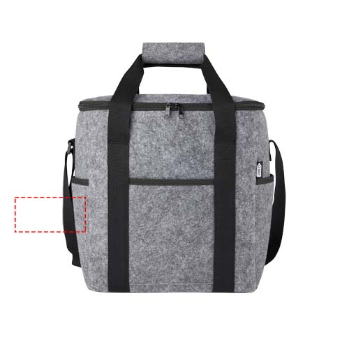 Large cooler bag made of high quality soft and durable GRS certified recycled felt. Features a large main compartment (six 1.5 litre bottles) lined with food safe and extra thick high density thermal PEVA insulation keeping beverages and refreshments cold for hours. Top zipper closure, front pocket, and two side pockets for extra storage. Adjustable long cotton woven shoulder straps (55 x 3.8 cm) and 2 woven cotton carry handles (25 x 3.8 cm) with top hook & loop closing. Easy to clean. Capacity: 21 litres.