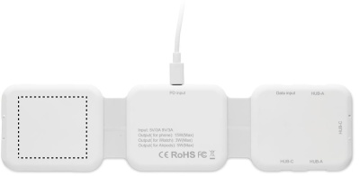 Magnetic charging station in ABS. 3 wireless charging spots. 1 x 15W, 1 x 5W for TWS and 1 Apple Watch charger (3W). 2 Type-C & 2 USB-A HUBS. Integrated cable input: connector from Type-C to USB-A.