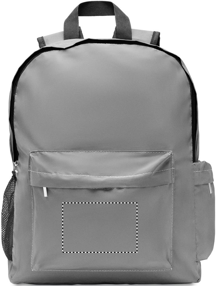 Backpack in high reflective 190T polyester and straps. It has 15 inch padded laptop compartment. Front zippered pocket, one side mesh pocket and other side zippered pocket. For comfort a padded back section in 600D recycled polyester.