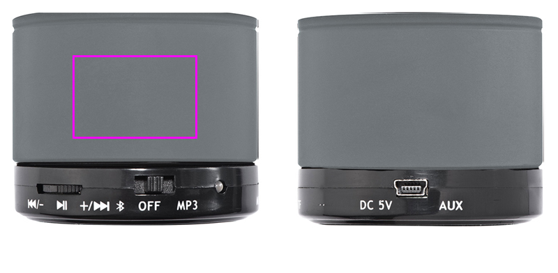 Mini Bluetooth speaker with USB port for charging, a range of up to 10 meters, charging time about 2h and a runtime of up to 1.5 hours. Your logo will be lasered on the speaker.