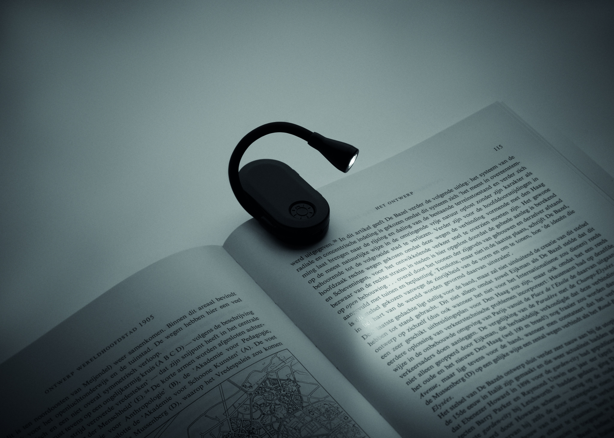 Rechargeable LED book light in ABS with flexible body and clip. Features 3 light settings, 300mAh battery.