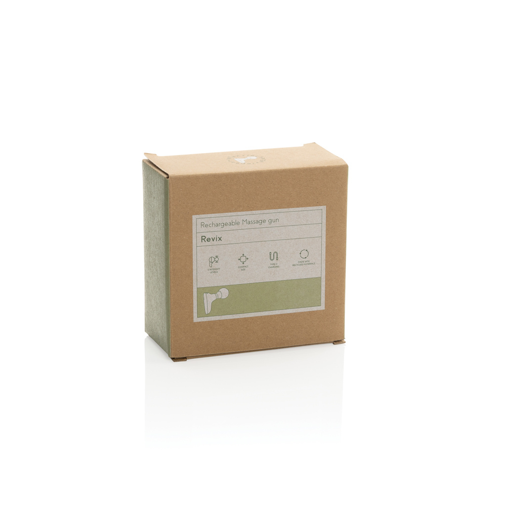 Experience precision and comfort with the Revix Massage Gun. The Revix massage gun combines innovative design with premium materials to deliver powerful relief and relaxation. With its compact size and lightweight build, it’s perfect for on-the-go recovery or at-home use. The high-performance lithium battery offers up to 3.5 hours of working time on a full charge, ensuring uninterrupted sessions for ultimate comfort. Its ergonomic silicone handle ensures a comfortable grip, while the integrated USB-C port allows for quick and efficient re-charging. The indicator light keeps you informed on power and charging status, while the included black rTPE USB-C cable adds convenience. Made out of RCS certified recycled ABS. RCS (Recycled Claim Standard) is a standard to verify the recycled content of a product throughout the whole supply chain. Total recycled content: 37% based on total item weight. Item and accessories are PVC-free and packed in FSC® packaging.