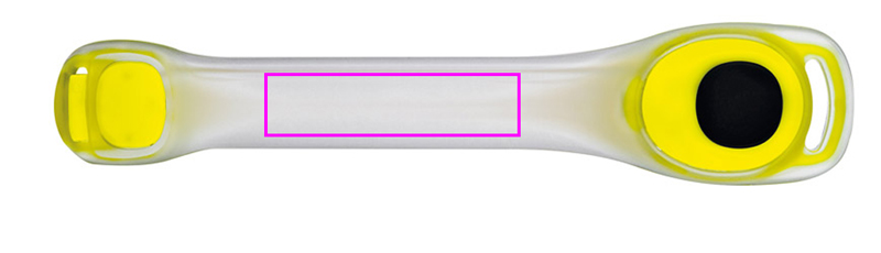 Safety LED wristband with two red LEDs with two light modes: steady light and flashing and a reflector strip on the closure. We print your logo on the transparent plastic part in the middle. Two button cells are already included.