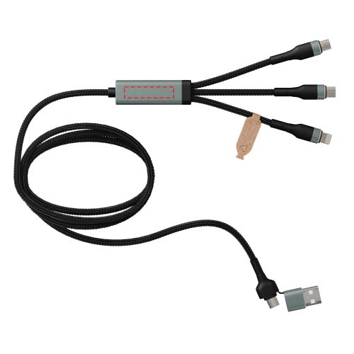 5-in-1 ultra-fast rPET 100W ultra fast charging cable that can charge smartphones, tablets and laptops. The dual USB-A + USB-C input makes the cable 100% compatible with the latest computer models. Output: Type-C, Micro USB, and Lightning. Delivered with recyclable TPU pouch and a recycled paper insert. Cable length: 1 metre.