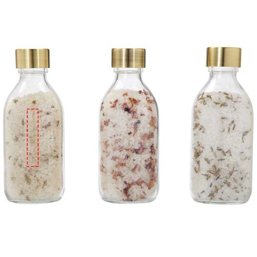 Gift set "Just Relax' with 3x 200 ml of bath salt from the Dead Sea in a clear glass bottle with steel cap in brass colour. Each bottle has a different scent: Roses, Lavender and Camomile. No bath at home? The bath salt can also be used to refresh and relax tired feet. The perfect gift for every occasion for an affordable price. Made in the Netherlands.