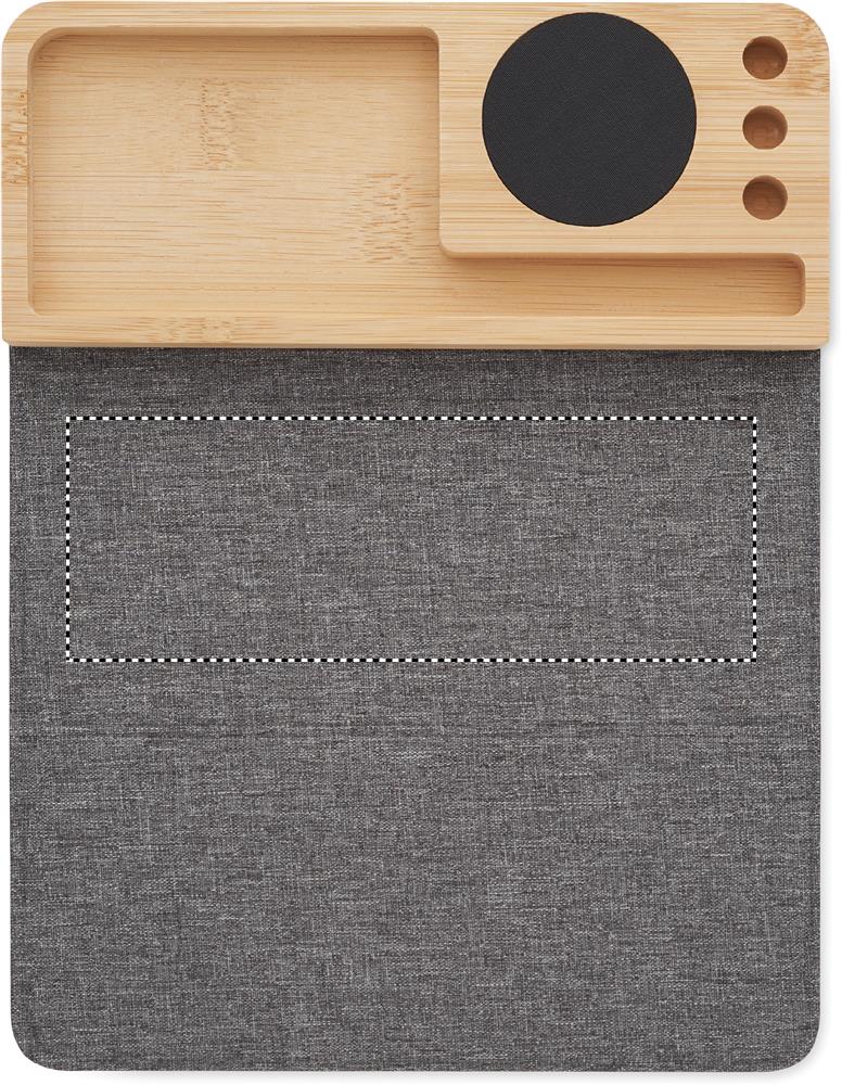 Wireless charger and desk organizer in bamboo with phone stand, 3 pen holders and foldable RPET mouse mat. Output: DC 9V/1.67A (15W). Compatible with all QI enabled devices such as latest Androids, iPhone® 8, X and newer.