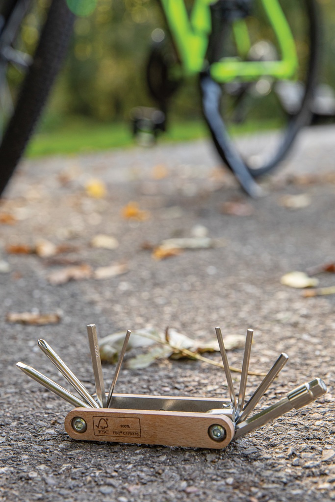 HEX tool made with FSC 100% beech wood and high hardness and corrosion resistant carbon steel (#45). Rockwell hardness 40-45. The item comes with 9 functions: Allen key 5.5mm; Allen key 2mm; Allen key 2.5mm; Allen key 3mm; Allen key 4mm; Allen key 5mm; Allen key 6mm; Philips screwdriver; Flat screwdriver. Packed in FSC mix kraft box.