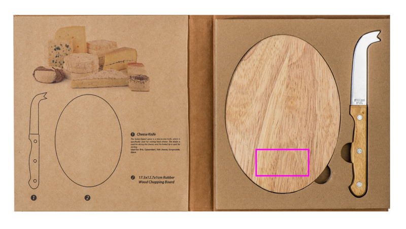 Juustukomplekt sisaldab ümmargust puidust tahvlit ja roostevabast terasest juustunuga, mida saab kasutada ka serveerimiseks. Teie logo graveeritakse tahvlile.