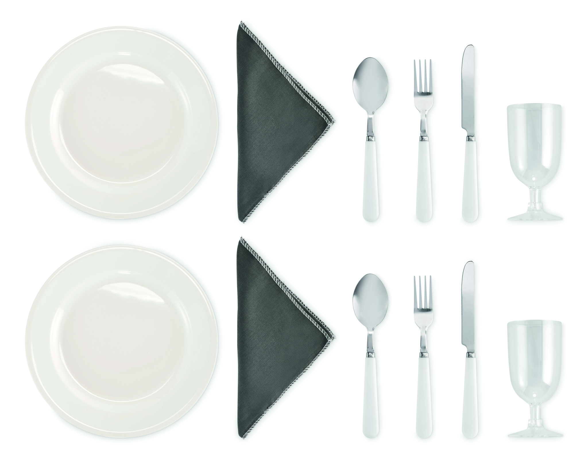 600D RPET polüestrist piknikujahutuskott kahele inimesele, millel on lukuga esitasku, sh roostevabast terasest söögiriistad, 2 polüstüreenist taldrikut, 2 polüstüreenist klaasi ja 2 puuvillast salvrätikut. Mahutavus: 18 l.