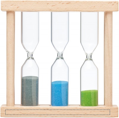 Puinen kolmiosainen tiimalasisetti, jossa on kolme eri ajastinta (n. 1, 3 ja 5 minuuttia).