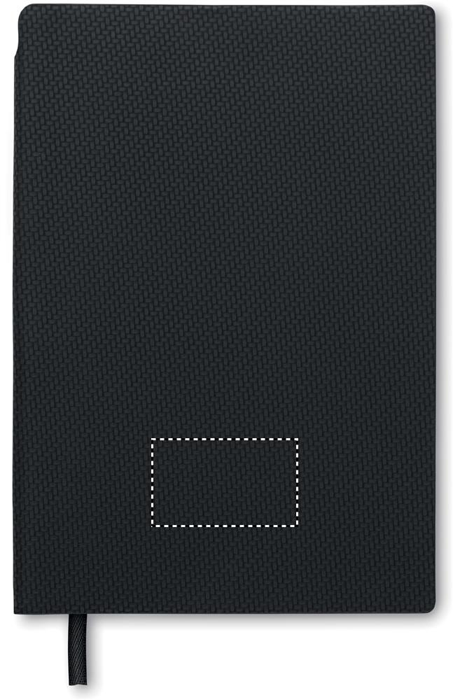 A5-kokoinen muistikirja strukturoidulla PU-kuorella ja ABS-kierrepallokynä selkä-kynäpidikkeen sisällä. Asia sidottu. 160 rivillistä sivua kierrätyspaperia (80 arkkia).