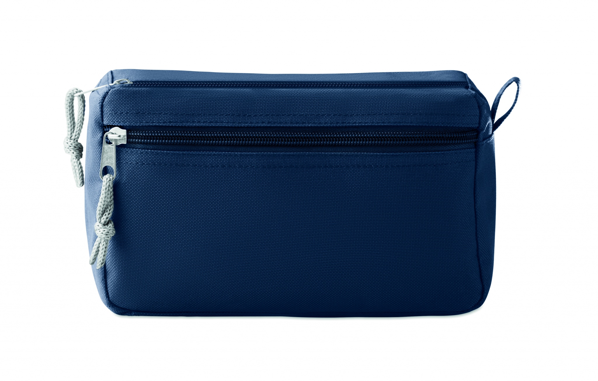 600D- polyesterinen kosmetiikkalaukku PPE-taustalla, kahdella vetoketjullisella taskulla.