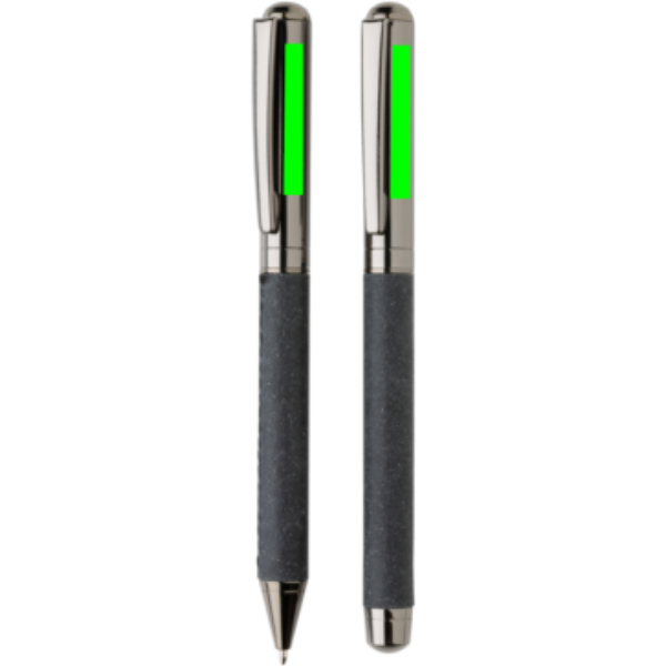 Tämä kaunis kynäsetti on valmistettu kierrätetystä nahkasta. Setissä on tyylikäs gunmetal-väriviimeistely, ja se on ihanteellinen muistiinpanojen kirjoittamiseen tyylillä. Setissä on kuulakärkikynä ja mustetäytekynä. Kummassakin kynässä on sininen Dokumental-muste. Kuulakärkikynän kirjoituspituus on 1200 metriä ja mustetäytekynän kirjoituspituus on 400 metriä. Kynä toimitetaan kierrätetystä nahkasta valmistetussa kotelossa ja lahjalaatikossa.