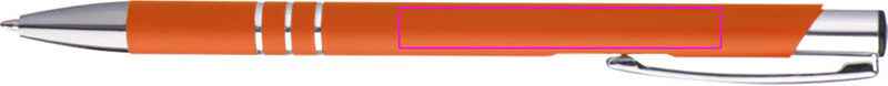 Ohut metallikuulakynä, jossa kumipinnoite ja sininen kirjoitusmuovitäyttö. Logosi kaiverretaan klipin alle.