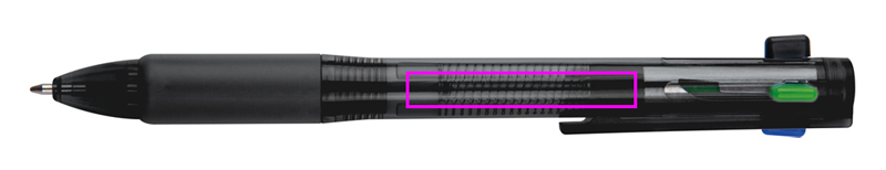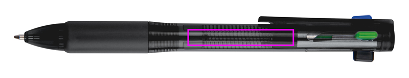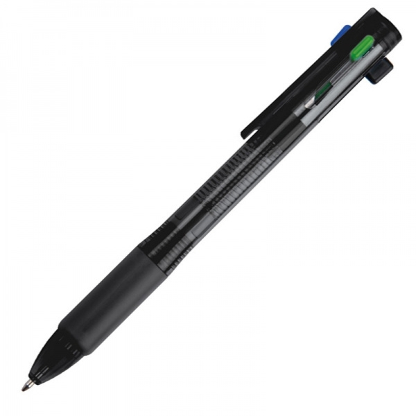 Muovinen kuulakynä, jossa on 4 värillistä kirjoitusmiinaa (sininen, musta, punainen ja vihreä.) Logosi painetaan klipsien alle.