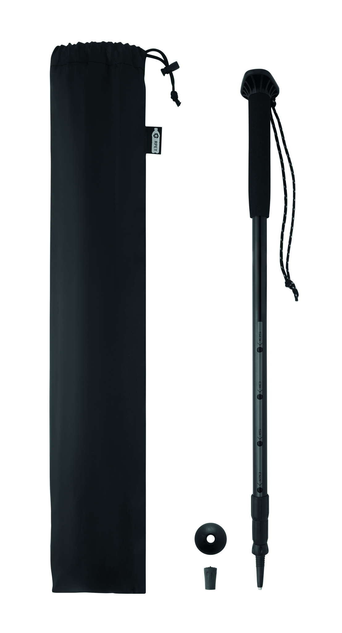 Teleskooppikävelysauva, jossa on EVA-kahva, rannehihna, kuminen kärki ja mutakori. Säädettävissä 105-120 cm. Pakattu RPET-vetoketjupussiin. Kevyt ja kestävä rakenne.