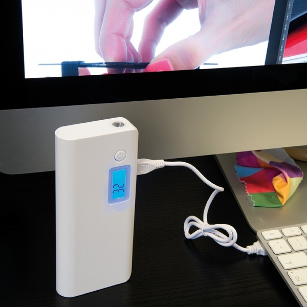 Virtapankki, jonka kapasiteetti on 10 000 mAH, USB-latauskaapeli ja digitaalinen käyttönäyttö, joka näyttää jäljellä olevan virran. Voit ladata älypuhelimesi useita kertoja tällä muovisella virtapankilla. Painamme logosi yläosaan.