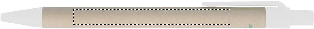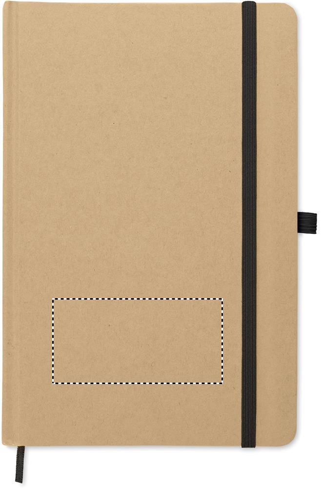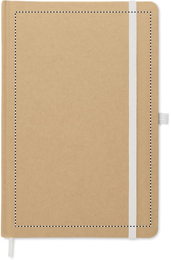 A5 piezīmju grāmatiņa ar cietu, pārstrādātu kartona vāku. Lieta ir saistīta. 160 rindu lapas (80 loksnes pārstrādāta papīra). Elastīga aizdares siksna un pildspalvas cilpa, lentes grāmatzīme. Iekļauts spiedpogas lodīšu pildspalva ar pārstrādāta papīra mucu. Zilā tinte.