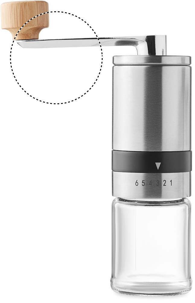 Kafijas komplekts. Ietver stikla un nerūsējošā tērauda kafejnīcu un manuālu keramikas kafijas dzirnaviņas ar bambusa detaļām. Tilpums: cafetiere 350ml, dzirnaviņas 100ml.