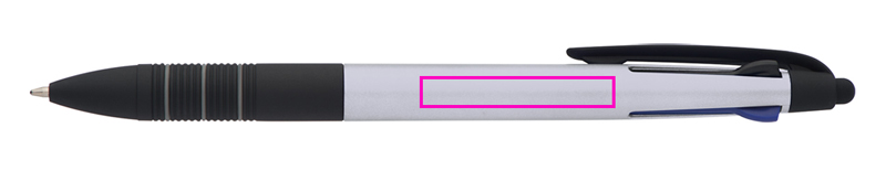 4in1 plastmasas lodīšu pildspalva ar 3 dažādām rakstīšanas krāsām (zila, sarkana un melna) + pieskāriena funkcija un gumijota satvēriena zona. Mēs uzdrukājam jūsu logotipu uz vārpstas.