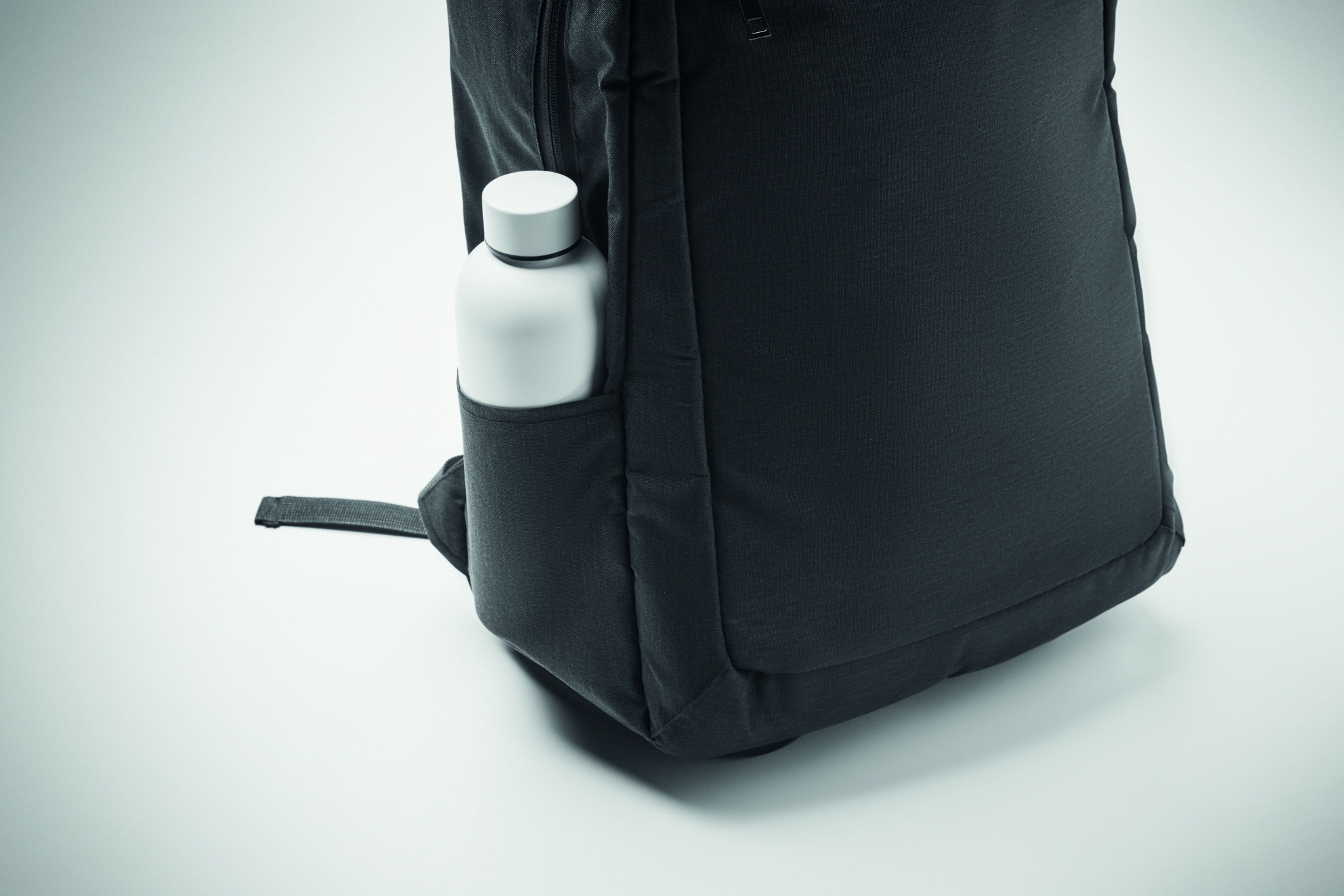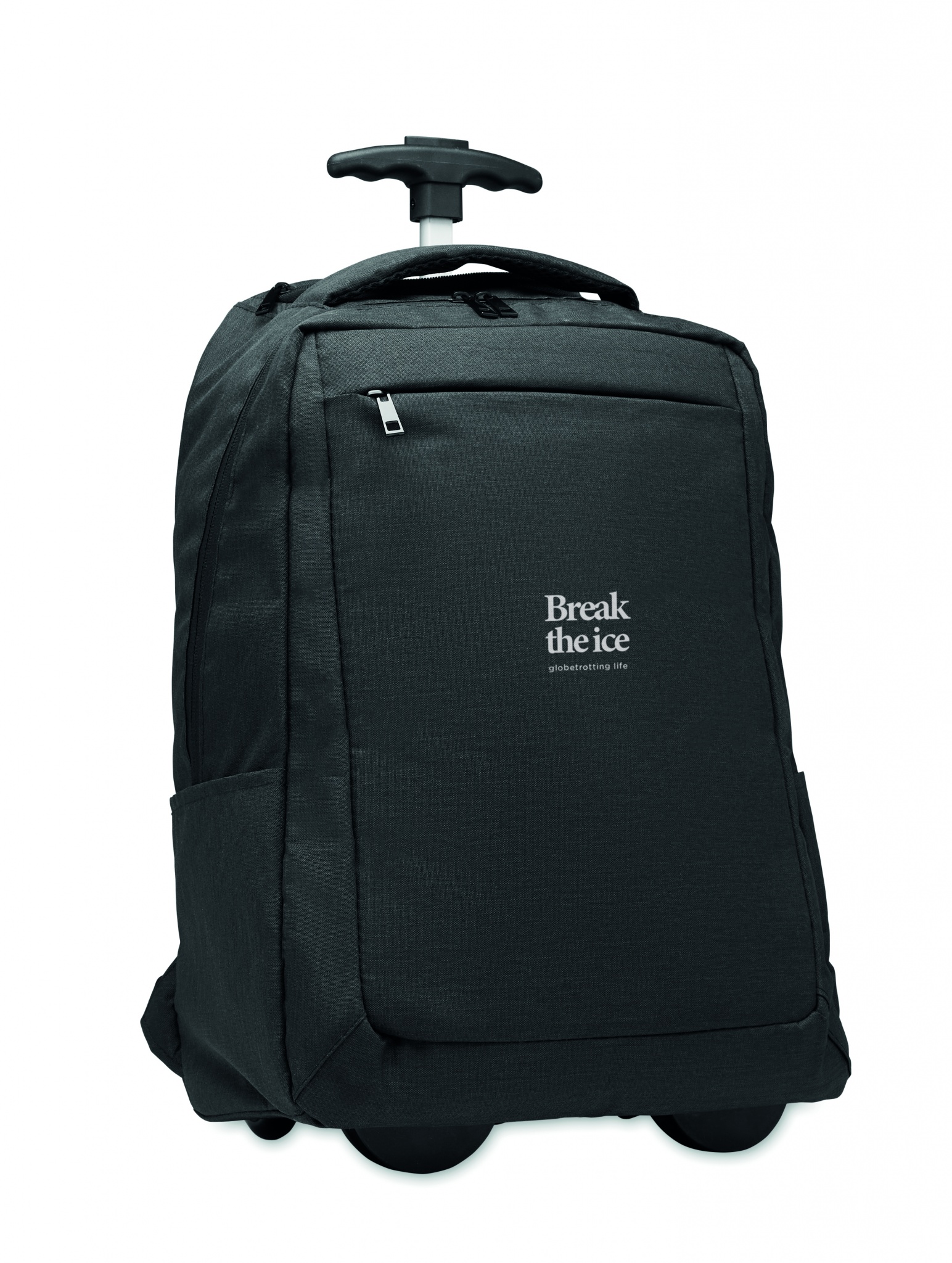 Рюкзак на колесах для ноутбука 15 дюймов из переработанного полиэстера 600D. Включает одно внутреннее отделение для 15-дюймового ноутбука. Передний карман на молнии. Два боковых накладных кармана. Три внутренних накладных кармана. Спинка и плечевые ремни с мягкой подкладкой. 2 колеса и двойная трубчатая рама.