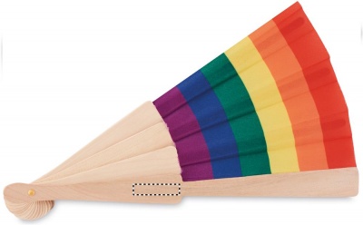 Ручной веер из дерева и полиэстера с радужным рисунком.