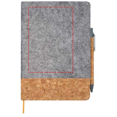 Блокнот формата A5 в твердой обложке изготовлен из пробки и переработанного фетра и состоит из 80 разлинованных листов бумаги плотностью 70 г/м², эластичной застежки, закладки-ленты и петли для ручки. Кнопка, зажим и кончик шариковой ручки изготовлены из переработанного пластика, а корпус — из пробки. Чернила для ручки: черный. Длина непрерывной линии: 600 метров. Размер пера: 1,0 мм.