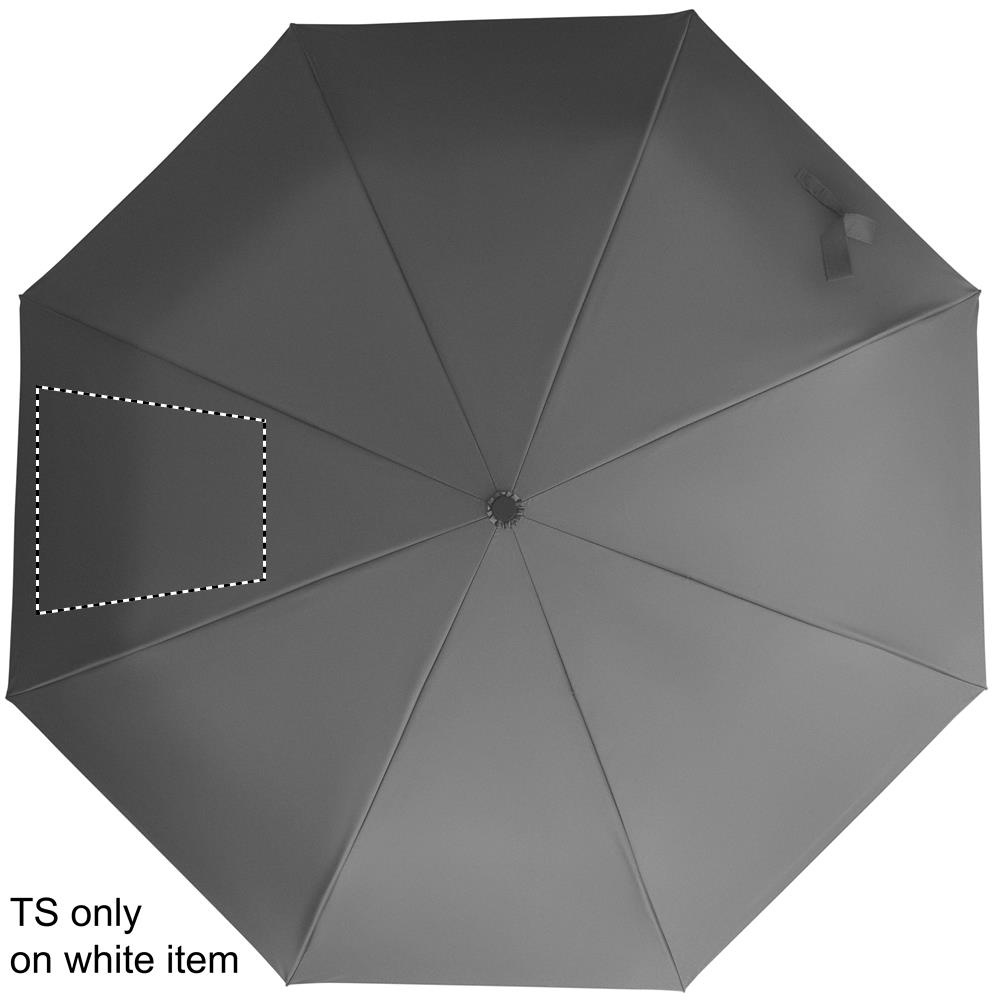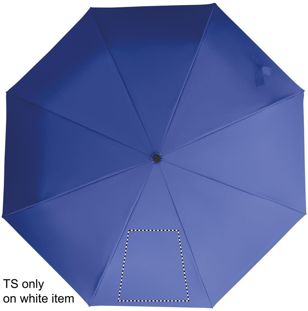 Vikbart 21'' vindtätt paraply med helt svartpläterad glasfiberram med 2 sektioner. Ribbor i glasfiber. 190T RPET pongee paneler. D-format karbinhakehandtag med gummifinish. Automatisk öppning och stängning. Inklusive påse