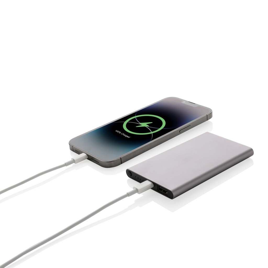 4.000 mAh powerbank med platt design där höljet är tillverkat av RCS-certifierad återvunnen aluminium/ABS-plast. RCS (Recycled Claim Standard) certifiering säkerställer en helt certifierad leveranskedja av de återvunna materialen. Totalt återvunnet innehåll: 36% baserat på total produktvikt. Powerbanken stöder både laddning via USB A och type C. Powerbanken innehåller ett 4.000 mAh litiumpolymerbatteri av klass A med lång livslängd. Strömindikatorerna visar den återstående energinivån så att du alltid vet när du behöver ladda om.; Type C-input 5V/2A; Type C-output: 5V/2A USB A-output: 5V/2A. Produkt och tillbehör är PVC-fria. Laddningskabel i RCS-certifierad återvunnen TPE medföljer. Levereras i FSC® mix-förpackning.