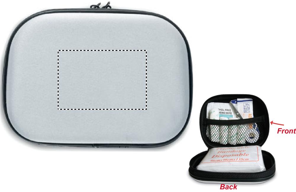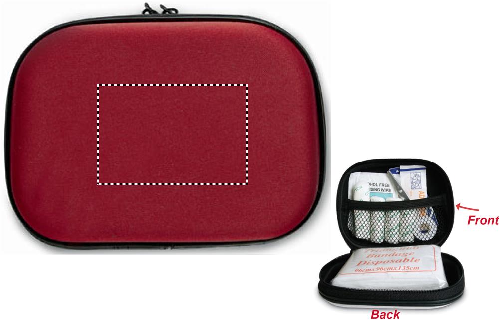 Första hjälpen kit i EVA material. Innehållandes sax, 3 bandage, 1 triangel bandage, 1 rulle bandageband i bomull, 2 sterila våtservetter, 5 limbandages, 1 tape and 6 bomullsvadds.