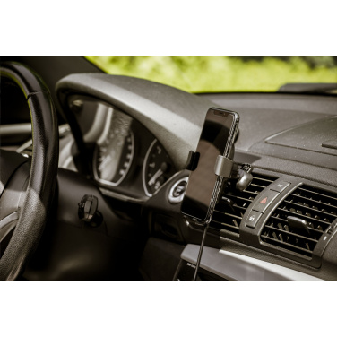 10W universell biltelefonhållare och laddare. Tillverkad av återvunnen ABS-plast. Denna telefonhållare är lätt att montera, anpassar sig efter storleken på din telefon och kan manövreras med en hand. Idealisk för satellitnavigering och för att ladda din telefon när du är på resande fot. Telefonen kan placeras i vertikalt eller horisontellt läge tack vare den 360° roterande klämman. Den trådlösa laddaren på 10 W är kompatibel med enheter som stöder trådlös QI-laddning (senaste generationerna Android och iPhone). Ingång: 5V/2A. Trådlös utgång: 5/2A 10W. Inkluderar en mikro-USB-kabel (TPE) och bruksanvisning. Denna produkt och dess tillbehör är PVC-fria. Varje föremål är individuellt förpackat.