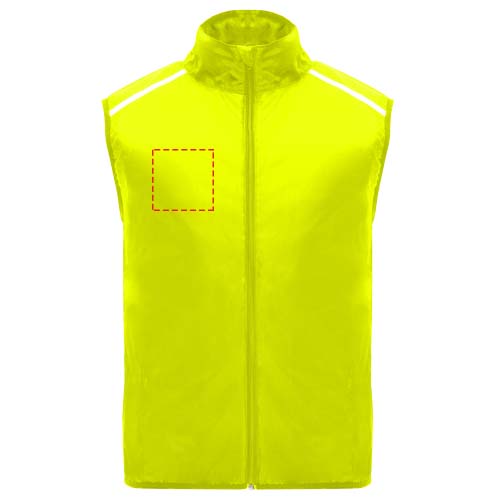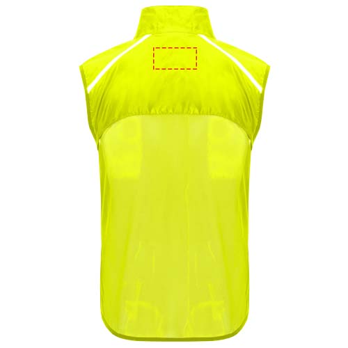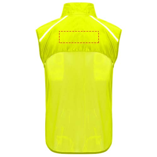 Vindtät och andningsbar. Dragkedja fram med matchande hakskydd. Elastisk bindning vid ärmhål och nederkant. Nedre delen av ryggen i mikroperforerat tyg. Detaljer med hög synlighet på ovansidan, framsidan och baksidan. Ficka med elastiskt band för att förvara västen och bära den på handleden. Avtagbar etikett.
