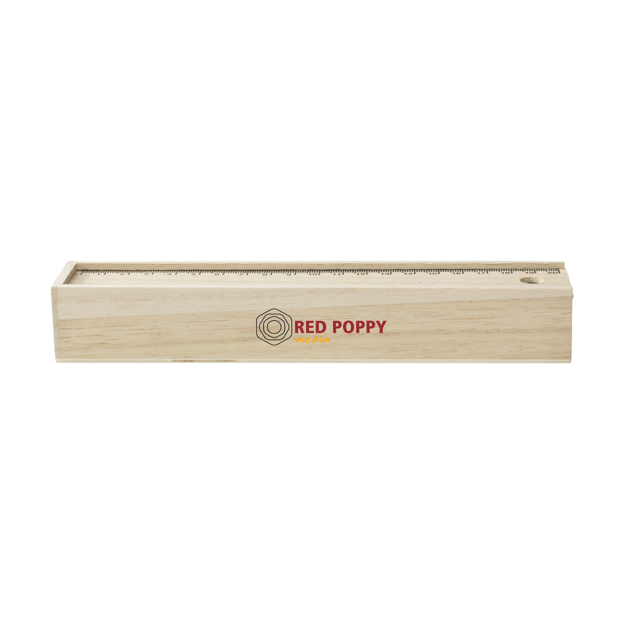 Träförvaringslåda med skjutlock (20 cm linjal), 12 vässade färgpennor och en trävässare.
