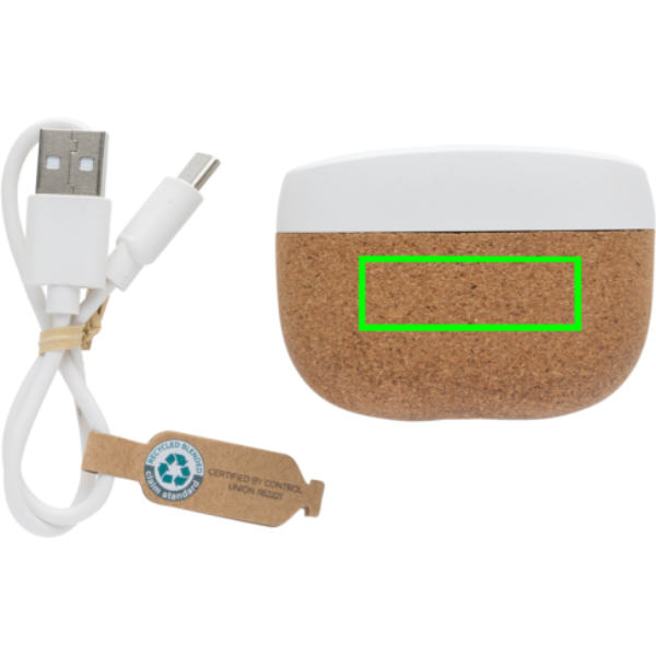 Trådlösa öronsnäckor med elegant design tillverkade av FSC® 100% kork och RCS (Recycled Claim Standard) certifierad återvunnen ABS. Totalt återvunnet innehåll: 35% baserat på total produktvikt. RCS-certifieringen garanterar en helt certifierad leveranskedja för de återvunna materialen. Öronsnäckorna har ett 35 mAh-batteri och kan laddas på nytt i 300 mAh-laddningsfodralet på 1,5 timme. Med automatisk parkoppling så det är enkelt att para ihop med din mobila enhet. Speltid på medelhög volym ca 3 timmar. Med BT 5.3 för optimal anslutning. Räckvidd upp till 10 meter. Med mikrofon för att besvara samtal. Membran i 3 storlekar samt laddningskabel av RCS-certifierad återvunnen TPE medföljer. Levereras i FSC® mix kraftförpackning. Produkten och tillbehören är 100% PVC-fria.