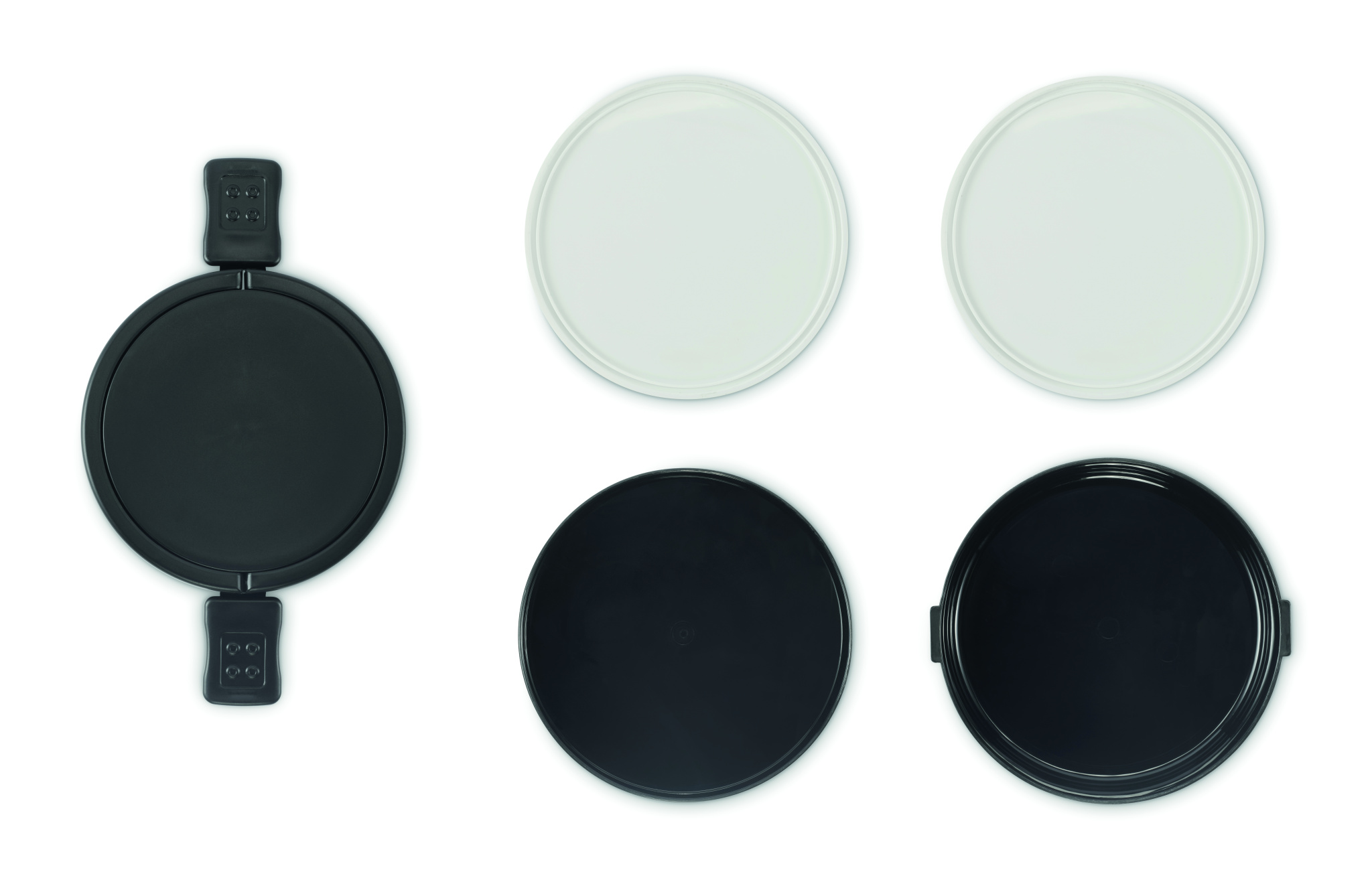 Tvådelad rund lunchlåda av PP med clipsstängning på sidan och handtag. Inklusive innerlock i vitt. Volym 250 ml upptill, 700 ml nedtill.