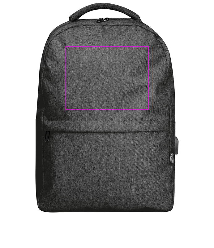 rPET-ryggsäck med USB-port, vadderade remmar, laptopfack, frontfack och stöldskyddsfack. Vi trycker din logotyp på det främre facket.