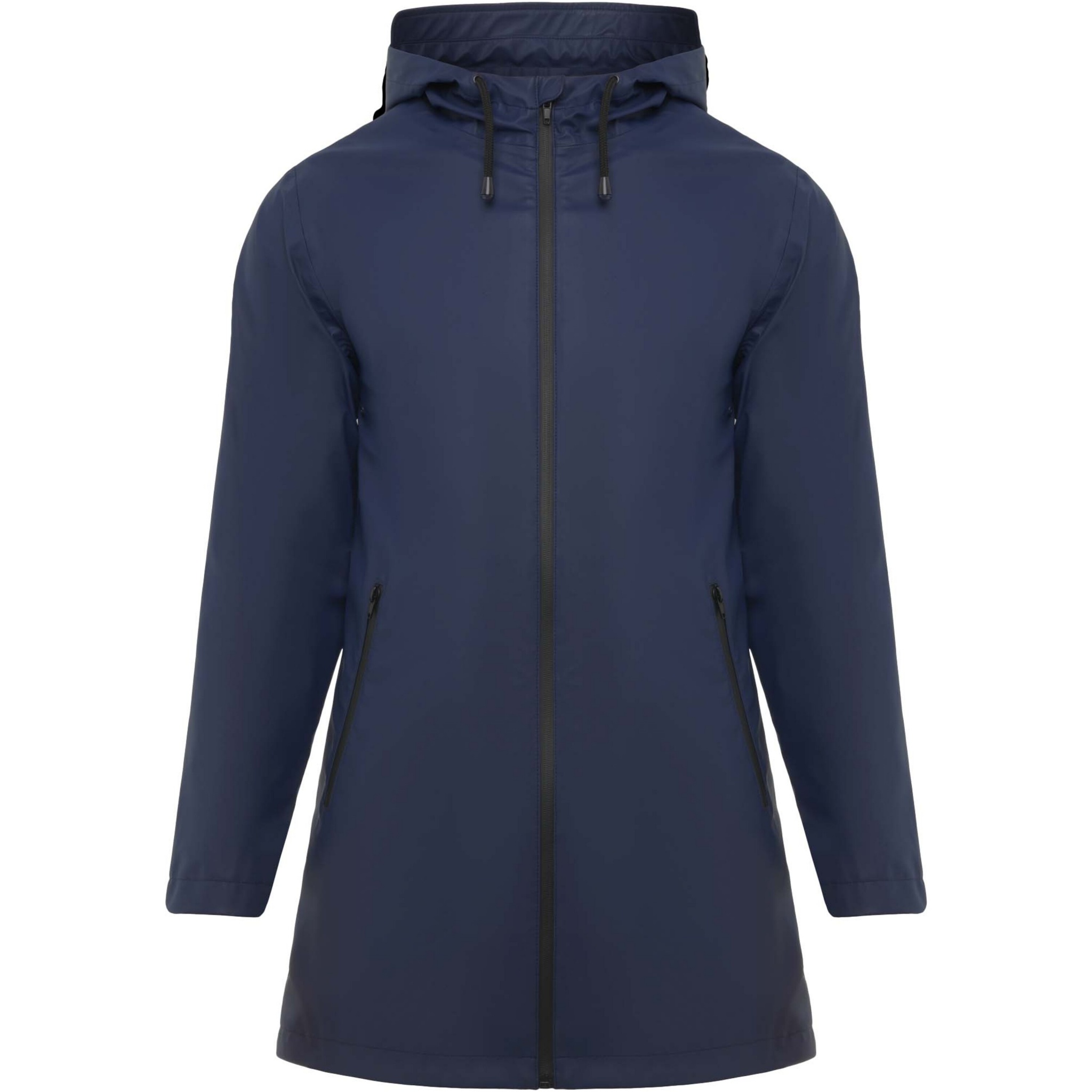 Vattentät regnjacka för dam. Huva med topp. Värmeförseglade dragkedjor och sömmar. Kontrasterande detaljer i svart. Två sidfickor med dragkedja. Slits i bakre fållen. Borttagbar etikett. Vattentät. Modellen är 179 cm och bär storlek S.