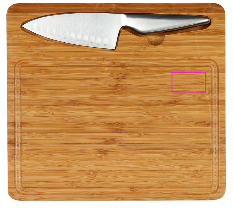 Vacker skärbräda av bambu med integrerad universalkniv av rostfritt stål. Kniven fixeras med en magnet i urtaget. Vi applicerar din logotyp med hjälp av lasergravering på knivbladet.